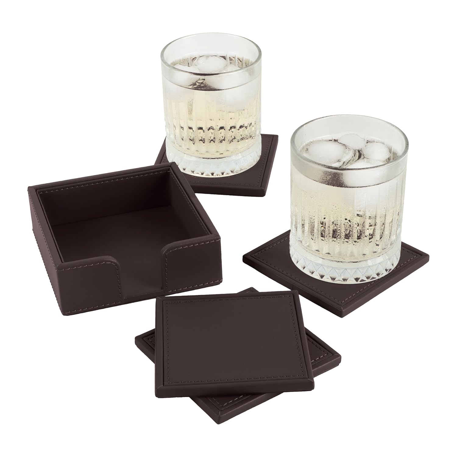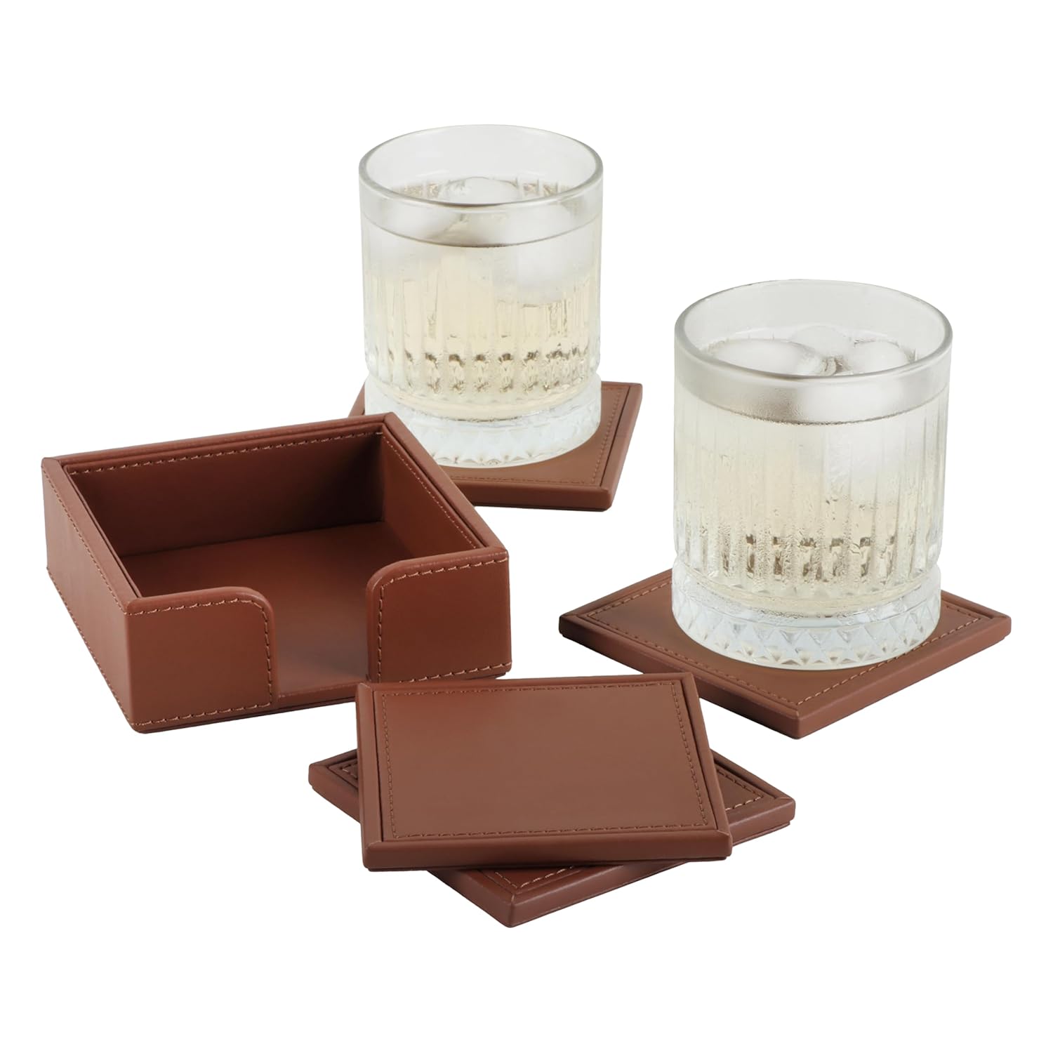V-CUBE DESIGNS Premium Vegan Leather Coaster - Set of 4 Coasters with Holder for Dining Table, Office Desks for Tea Cups, Coffee Mugs, Glasses - Durable & Long Lasting , Decor Accessories